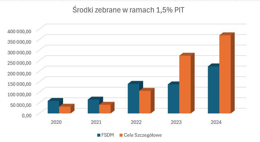 W rozliczeniu PIT za 2024 r. na cele szczególne udało się pozyskać 370 740 pln. Umowy dotyczące zbierania 1,5% zostały zawarte z ponad 50 podmiotami. Pozyskane środki pozostają do wyłącznej dyspozycji podmiotu podpisującego umowę.